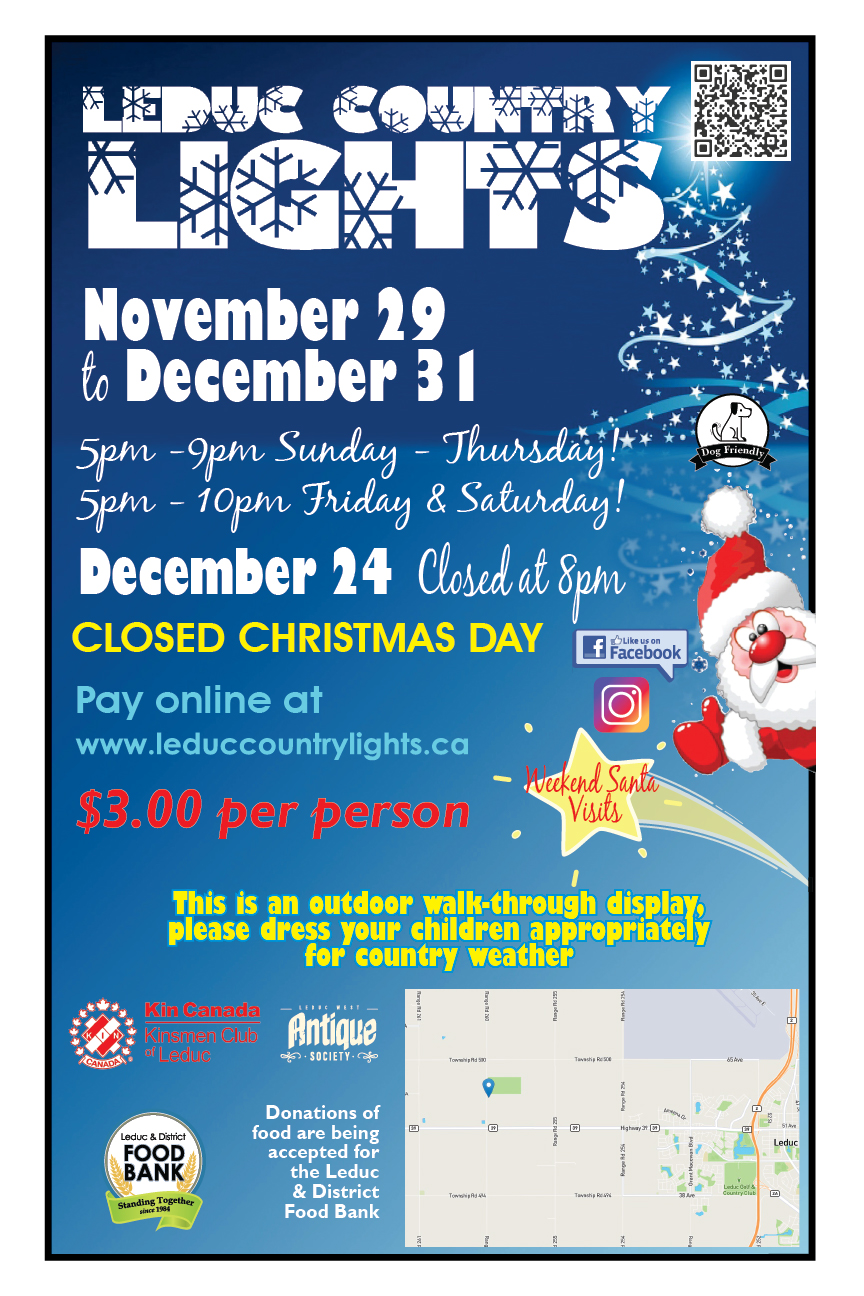 Pick any night in December (except Christmas Day) and come out to see the amazing display of lights decorating the park, thanks to the hard working volunteers of the Kinsmen Club of Leduc and the Leduc West Antique Society. Immerse yourself with the holiday spirit that will prove to become a tradition for your family, as it has with many families over the last 16 years.