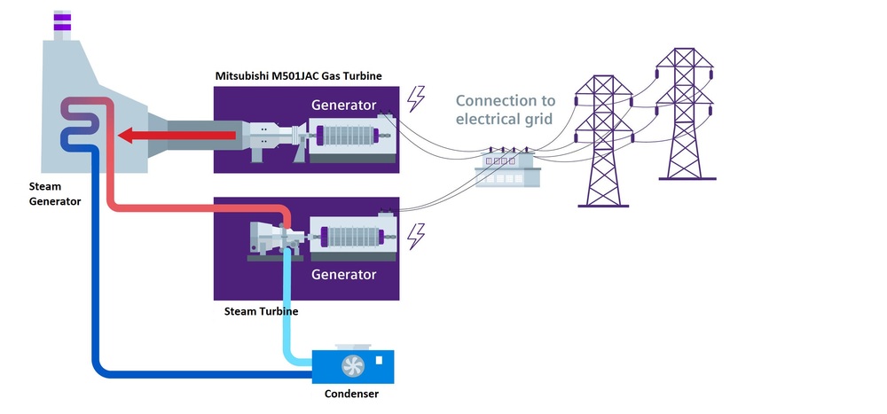 The Unit 1 & Unit 2 conversion project involved installing a new Mitsubishi M501JAC gas-fired combustion turbine and a Vogt triple-pressure heat recovery steam generator on each unit, now labelled GNR1 & GNR2. The captured exhaust gas from the combustion turbine is sent to the steam generator, heating the process water and converting it to steam which is then directed to the blades of the steam turbine, spinning the legacy GEC 400MW generators, which, combined with the output of the gas turbine results in a total maximim capability of 466 net MW from each unit.
